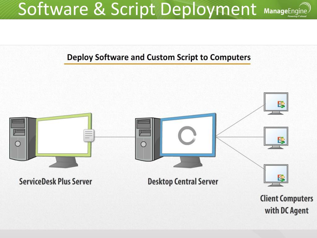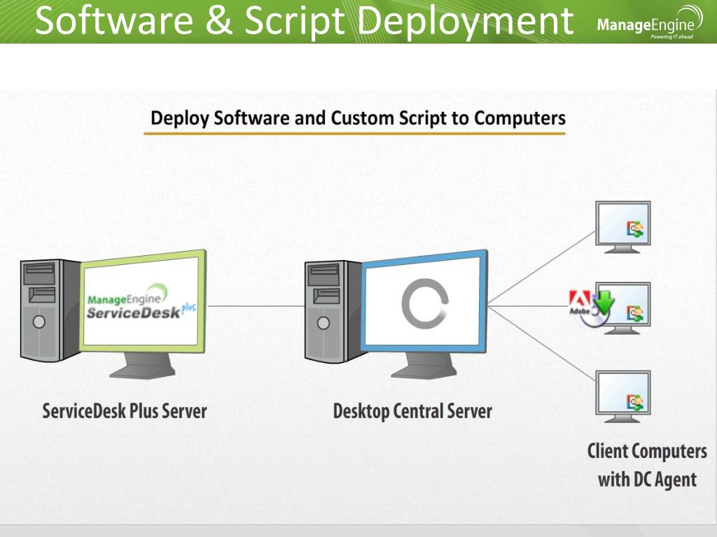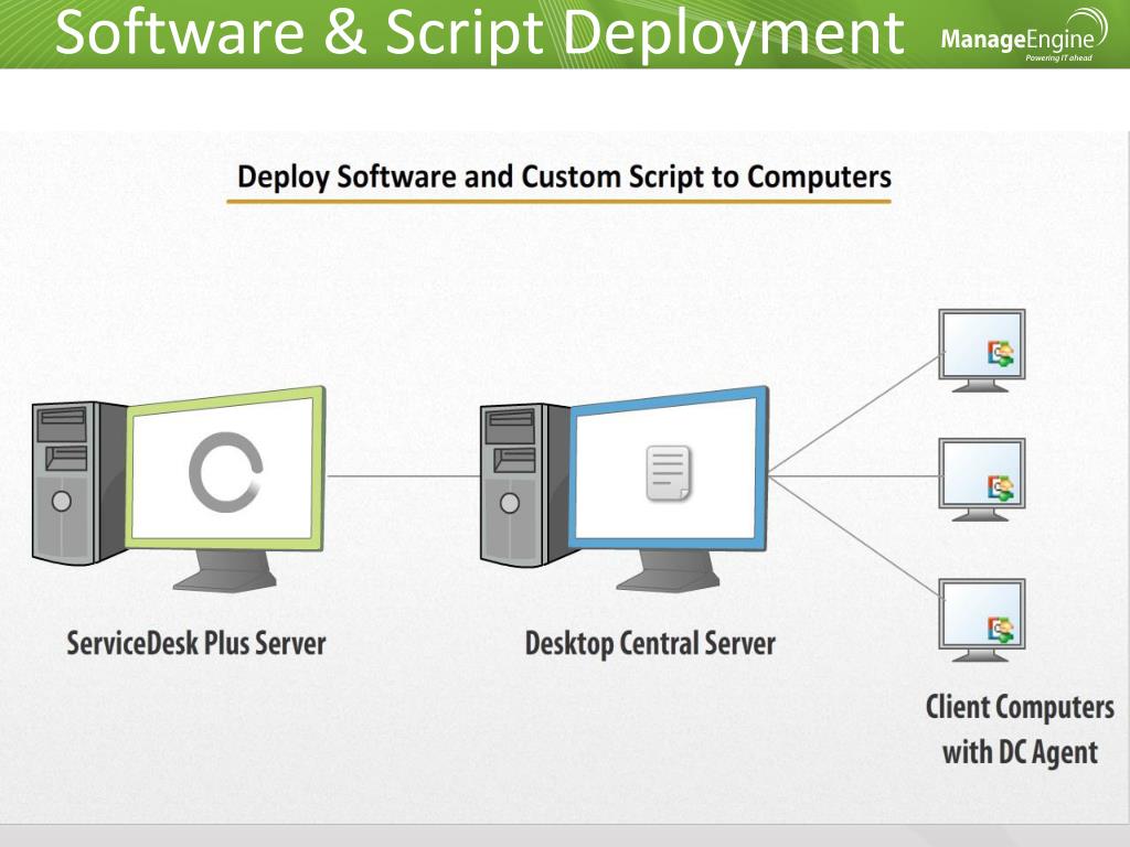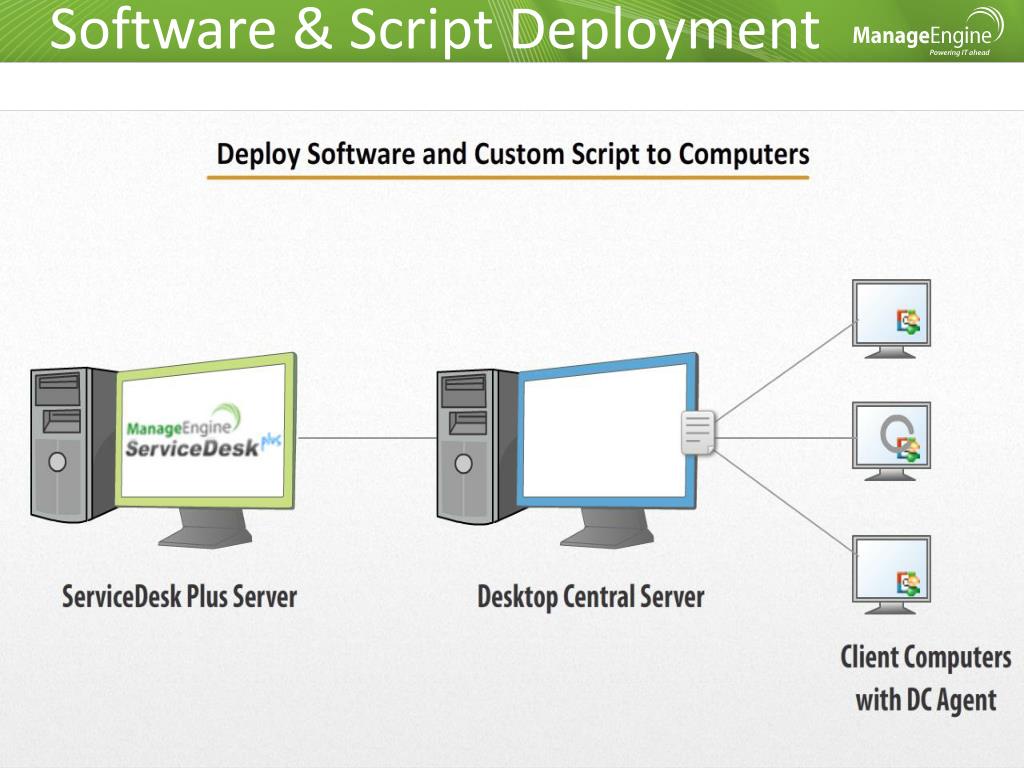 Integration with ME Products • Integrates with • ServiceDesk Plus, IT 360, Asset Explorer and ServiceDesk Plus MSP • Customers have driven this integration; over 40% of SDP customers are Desktop Central customers • Helps Help Desk to initiate action on a request using Desktop Central (ITIL Service Operations)
