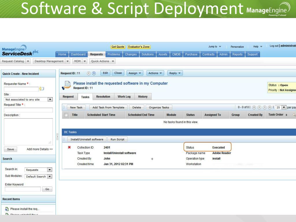 Benefits of Integration • Single Sign-on • Centralized Asset Information in ServiceDesk Plus CMDB • Automatic Ticket Creation of Events related to Systems Management • User Requests as Tickets from Agent tray icon (even your mailing system is down) • Ability to Install or Uninstall Software from ServiceDesk Plus • Automatic Patching of Windows and other 3rd party applications • Enhanced Reporting and Auditing Capabilities