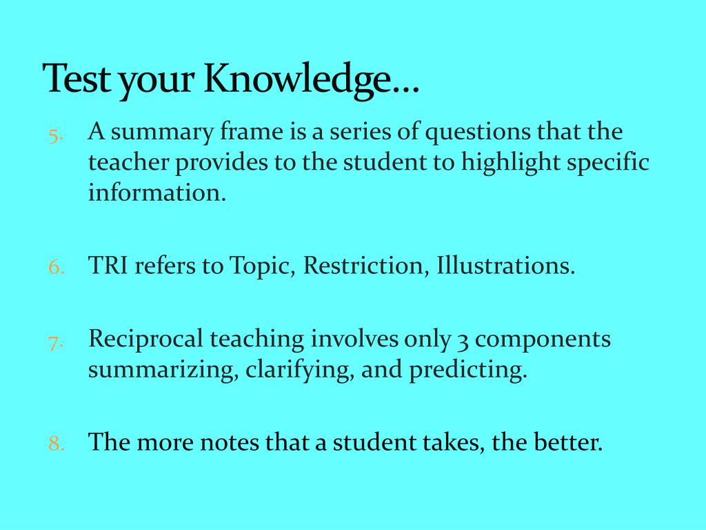 Test your Knowledge… • A summary frame is a series of questions that the teacher provides to the student to highlight specific information. • TRI refers to Topic, Restriction, Illustrations. • Reciprocal teaching involves only 3 components summarizing, clarifying, and predicting. • The more notes that a student takes, the better.