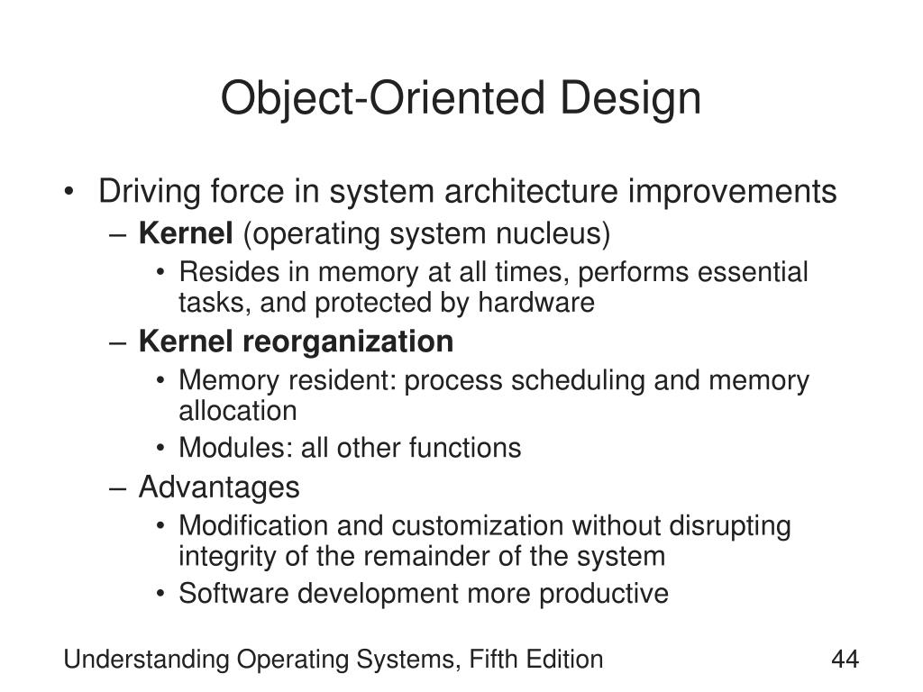 Object-Oriented Design • Driving force in system architecture improvements • Kernel (operating system nucleus) • Resides in memory at all times, performs essential tasks, and protected by hardware • Kernel reorganization • Memory resident: process scheduling and memory allocation • Modules: all other functions • Advantages • Modification and customization without disrupting integrity of the remainder of the system • Software development more productive Understanding Operating Systems, Fifth Edition