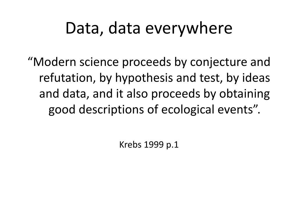 Data, data everywhere “Modern science proceeds by conjecture and refutation, by hypothesis and test, by ideas and data, and it also proceeds by obtaining good descriptions of ecological events”. Krebs 1999 p.1