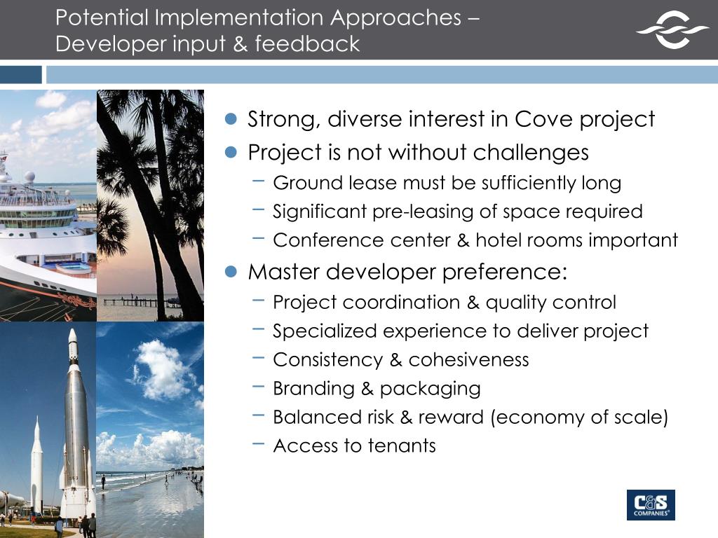 Potential Implementation Approaches –Developer input & feedback • Strong, diverse interest in Cove project • Project is not without challenges • Ground lease must be sufficiently long • Significant pre-leasing of space required • Conference center & hotel rooms important • Master developer preference: • Project coordination & quality control • Specialized experience to deliver project • Consistency & cohesiveness • Branding & packaging • Balanced risk & reward (economy of scale) • Access to tenants