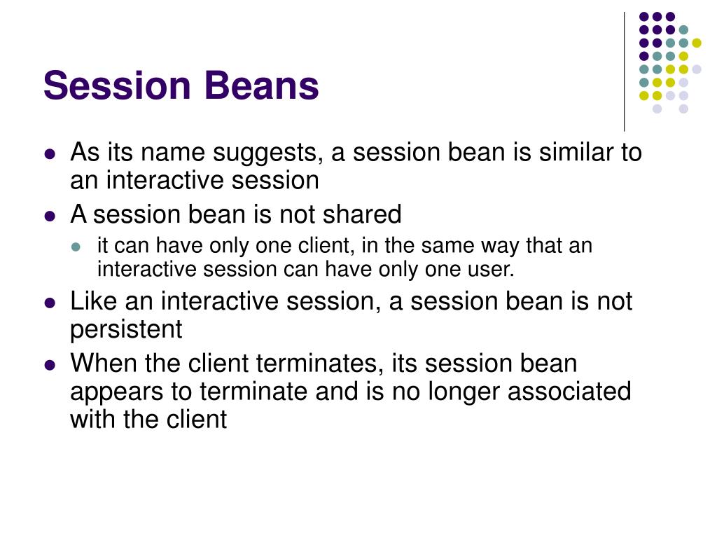 Session Beans • As its name suggests, a session bean is similar to an interactive session • A session bean is not shared • it can have only one client, in the same way that an interactive session can have only one user. • Like an interactive session, a session bean is not persistent • When the client terminates, its session bean appears to terminate and is no longer associated with the client