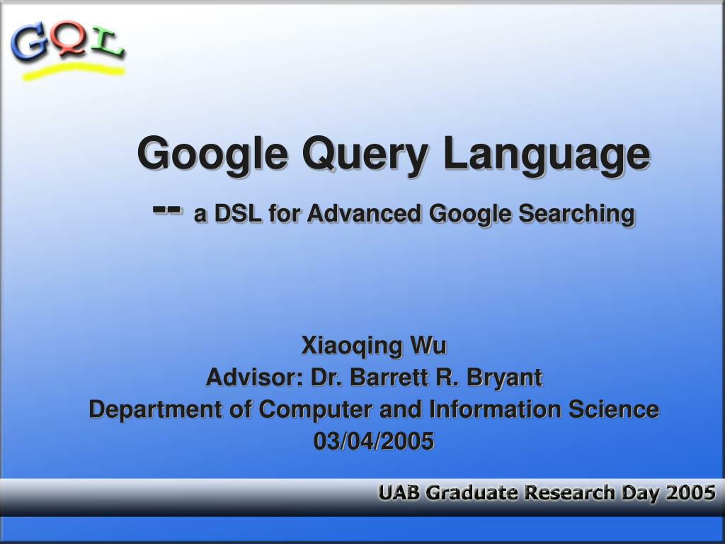 Google Query Language -- a DSL for Advanced Google Searching Xiaoqing Wu Advisor: Dr. Barrett R. Bryant Department of Computer and Information Science 03/04/2005