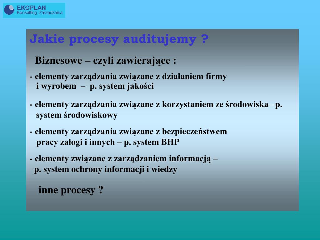 Jakie procesy auditujemy ? Biznesowe – czyli zawierające : - elementy zarządzania związane z działaniem firmy i wyrobem – p. system jakości - elementy zarządzania związane z korzystaniem ze środowiska– p. system środowiskowy - elementy zarządzania związane z bezpieczeństwem pracy załogi i innych – p. system BHP - elementy związane z zarządzaniem informacją – p. system ochrony informacji i wiedzy inne procesy ?