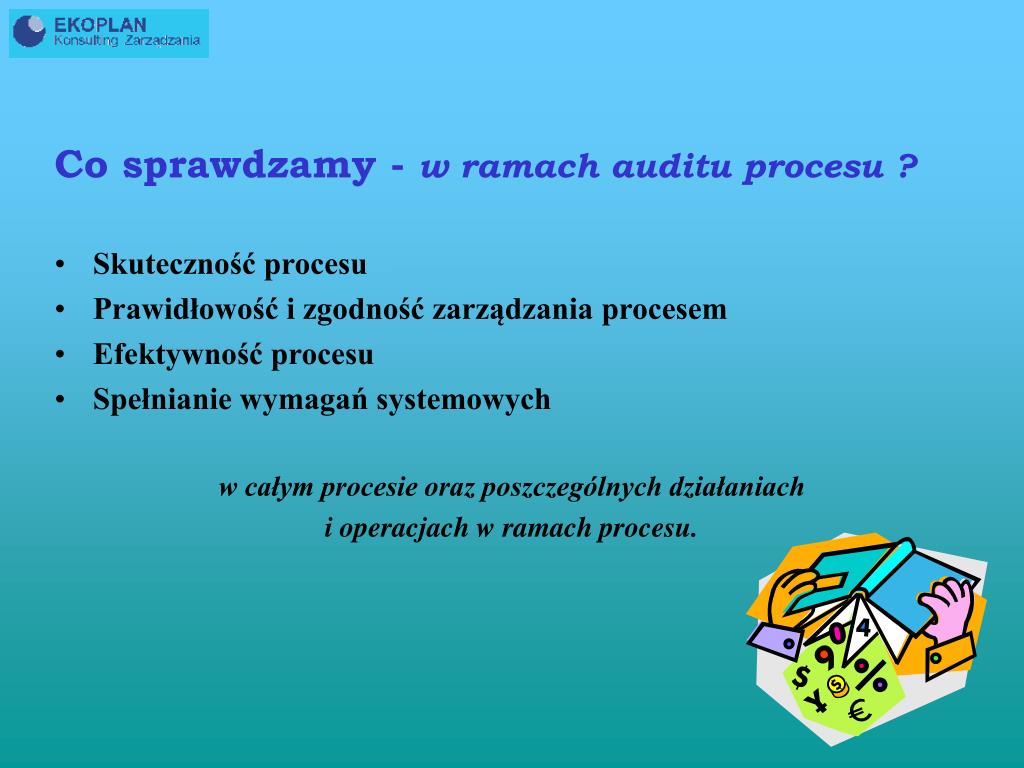 Co sprawdzamy - w ramach auditu procesu ? • Skuteczność procesu • Prawidłowość i zgodność zarządzania procesem • Efektywność procesu • Spełnianie wymagań systemowych w całym procesie oraz poszczególnych działaniach i operacjach w ramach procesu.
