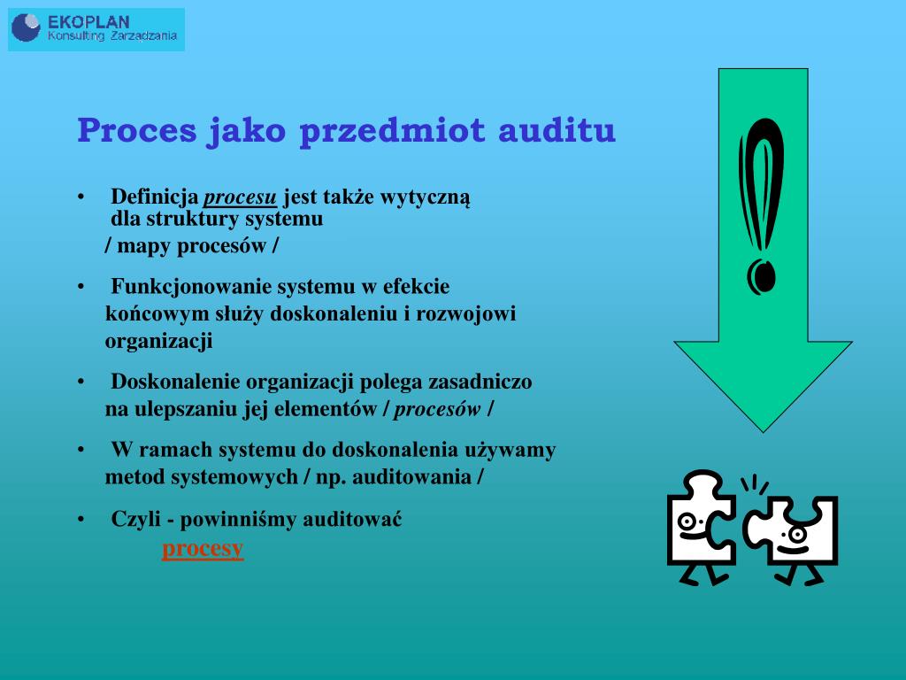 Proces jako przedmiot auditu • Definicja procesu jest także wytyczną dla struktury systemu / mapy procesów / • Funkcjonowanie systemu w efekcie końcowym służy doskonaleniu i rozwojowi organizacji • Doskonalenie organizacji polega zasadniczo na ulepszaniu jej elementów / procesów / • W ramach systemu do doskonalenia używamy metod systemowych / np. auditowania / • Czyli - powinniśmy auditować procesy