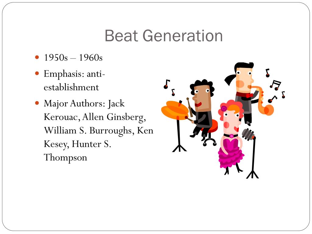 Beat Generation • 1950s – 1960s • Emphasis: anti-establishment • Major Authors: Jack Kerouac, Allen Ginsberg, William S. Burroughs, Ken Kesey, Hunter S. Thompson