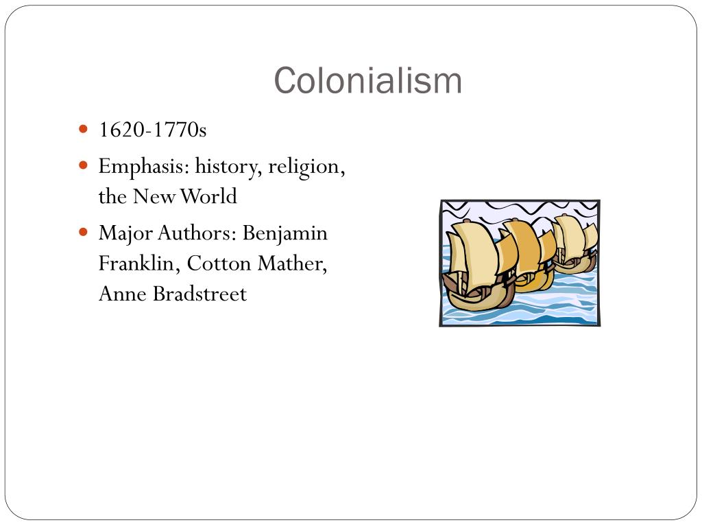 Colonialism • 1620-1770s • Emphasis: history, religion, the New World • Major Authors: Benjamin Franklin, Cotton Mather, Anne Bradstreet