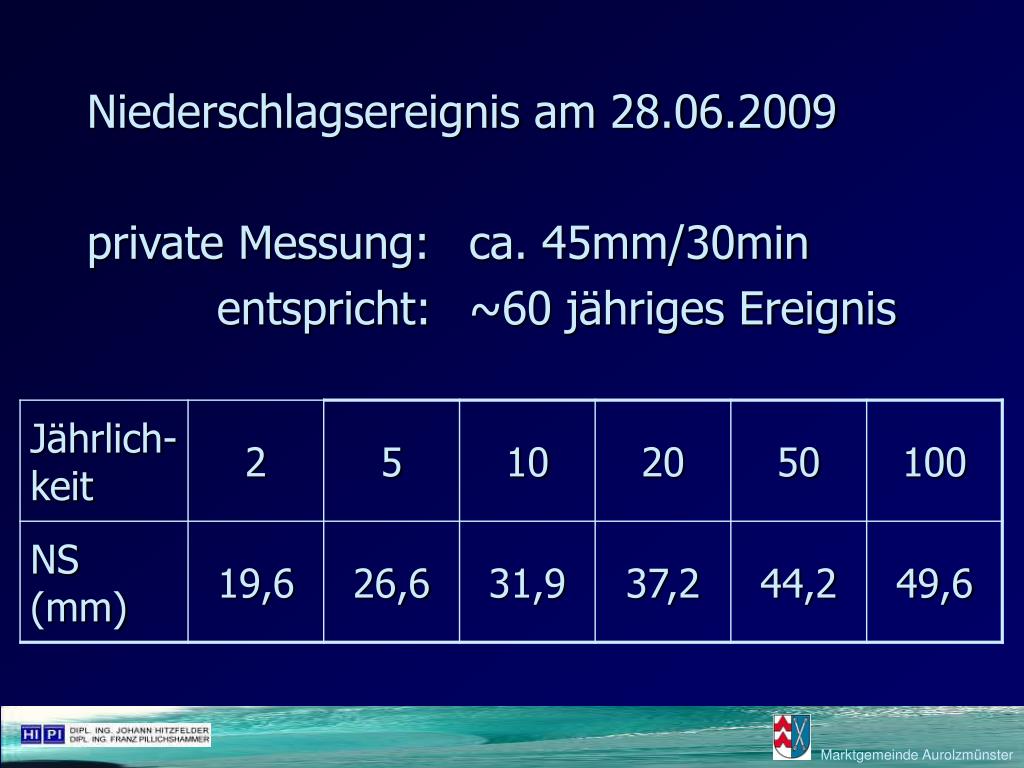 Marktgemeinde Aurolzmünster. Diplomingenieure Hitzfelder & Pillichshammer 4840 Vöcklabruck. Niederschlagsereignis am 28.06.2009 private Messung: ca. 45mm/30min entspricht: ~60 jähriges Ereignis. ABA Ried im Innkreis. Detailprojekt: