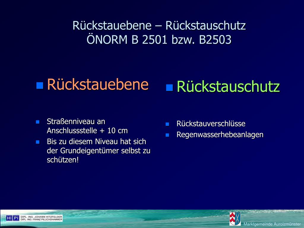 Rückstauebene – RückstauschutzÖNORM B 2501 bzw. B2503 • Rückstauebene • Straßenniveau an Anschlussstelle + 10 cm • Bis zu diesem Niveau hat sich der Grundeigentümer selbst zu schützen! • Rückstauschutz • Rückstauverschlüsse • Regenwasserhebeanlagen