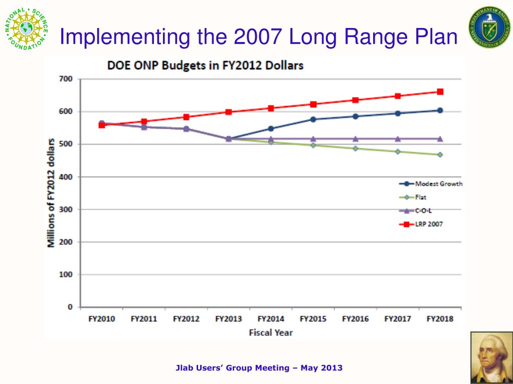 Implementing the 2007 Long Range Plan • Budget Options • Starting with President’s FY2013 request, 3 options considered: • Flat-flat funding (no growth, no COL increase) • Cost of Living (no growth, COL increase) • Modest Growth (poorly defined in charge letter) • For comparison: • Used LRP line adjusted for inflation