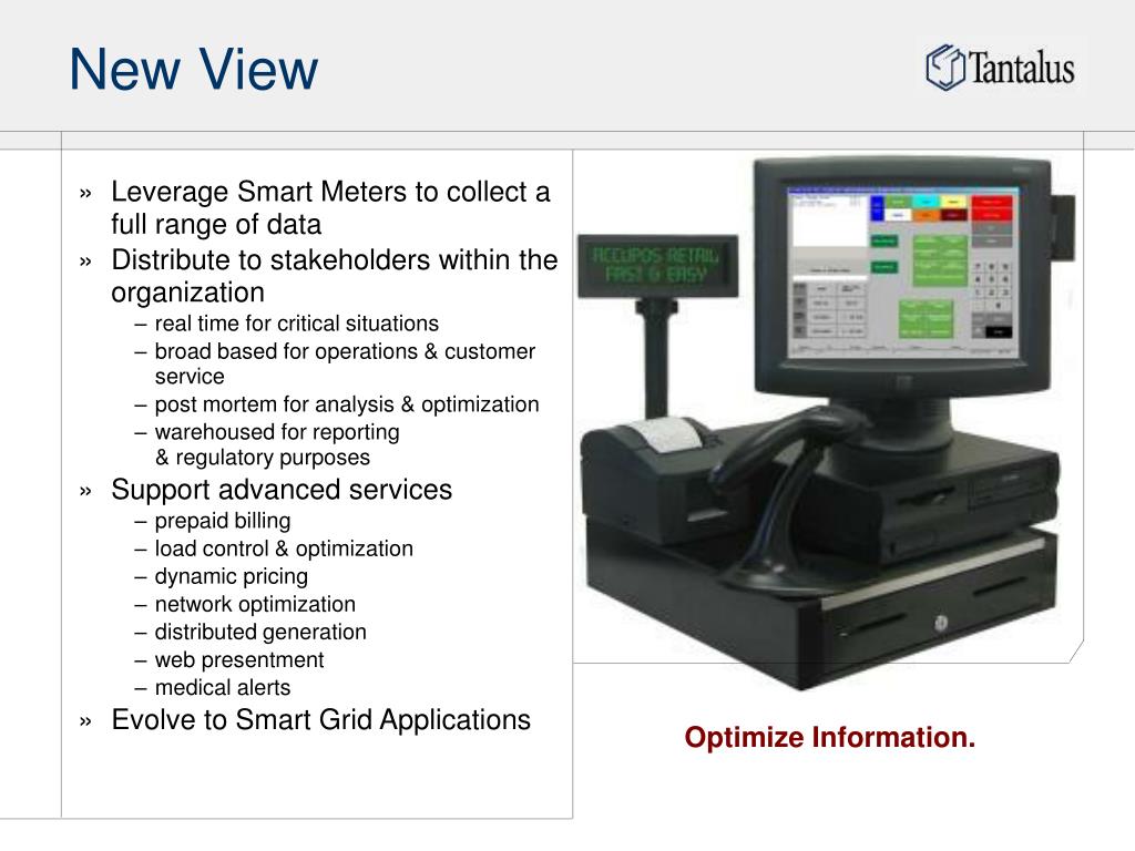 New View • Leverage Smart Meters to collect a full range of data • Distribute to stakeholders within the organization • real time for critical situations • broad based for operations & customer service • post mortem for analysis & optimization • warehoused for reporting& regulatory purposes • Support advanced services • prepaid billing • load control & optimization • dynamic pricing • network optimization • distributed generation • web presentment • medical alerts • Evolve to Smart Grid Applications Optimize Information.