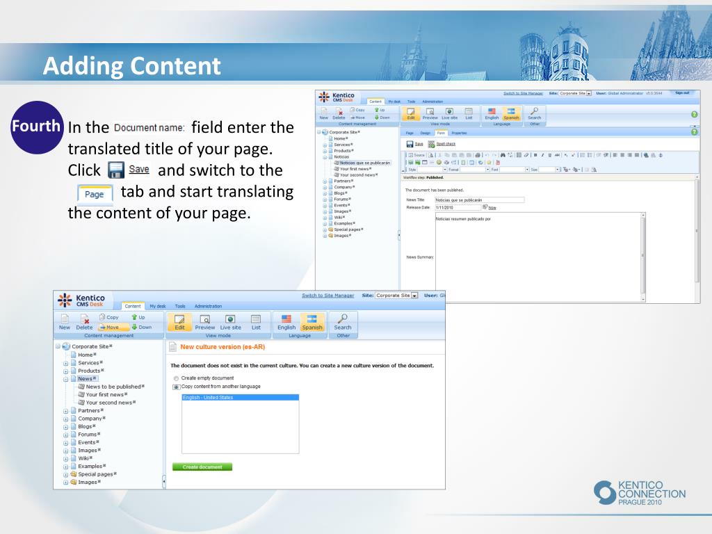 Adding Content Fourth In the field enter the translated title of your page. Click and switch to the tab and start translating the content of your page.