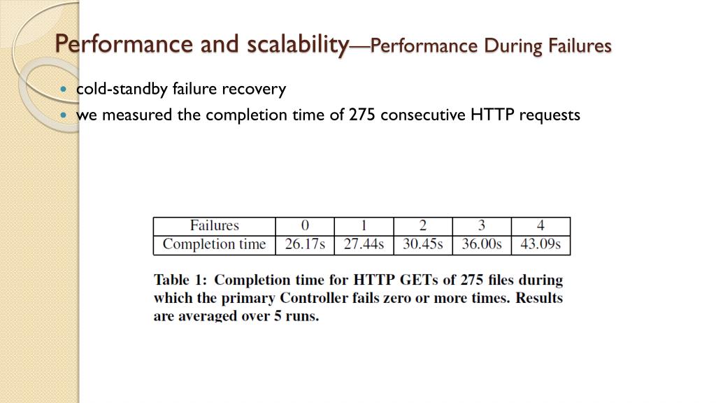 Performance and scalability—Performance During Failures • cold-standby failure recovery • we measuredthe completion time of 275 consecutive HTTP requests
