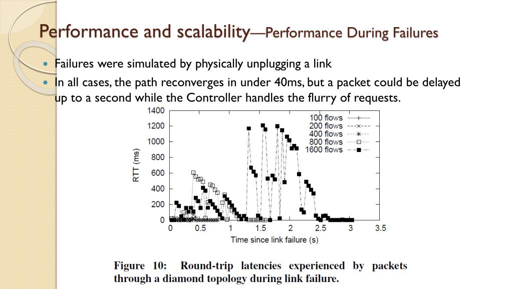 Performance and scalability—Performance During Failures • Failures were simulated by physically unplugging a link • In all cases, the path reconverges in under 40ms, but a packet couldbe delayed up to a second while the Controller handles the flurry ofrequests.