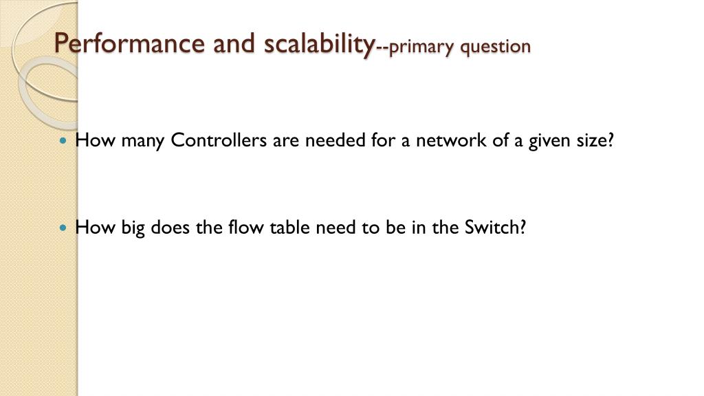 Performance and scalability--primary question • How many Controllers are needed for a network of a given size? • How big does the flow table need to be in the Switch?