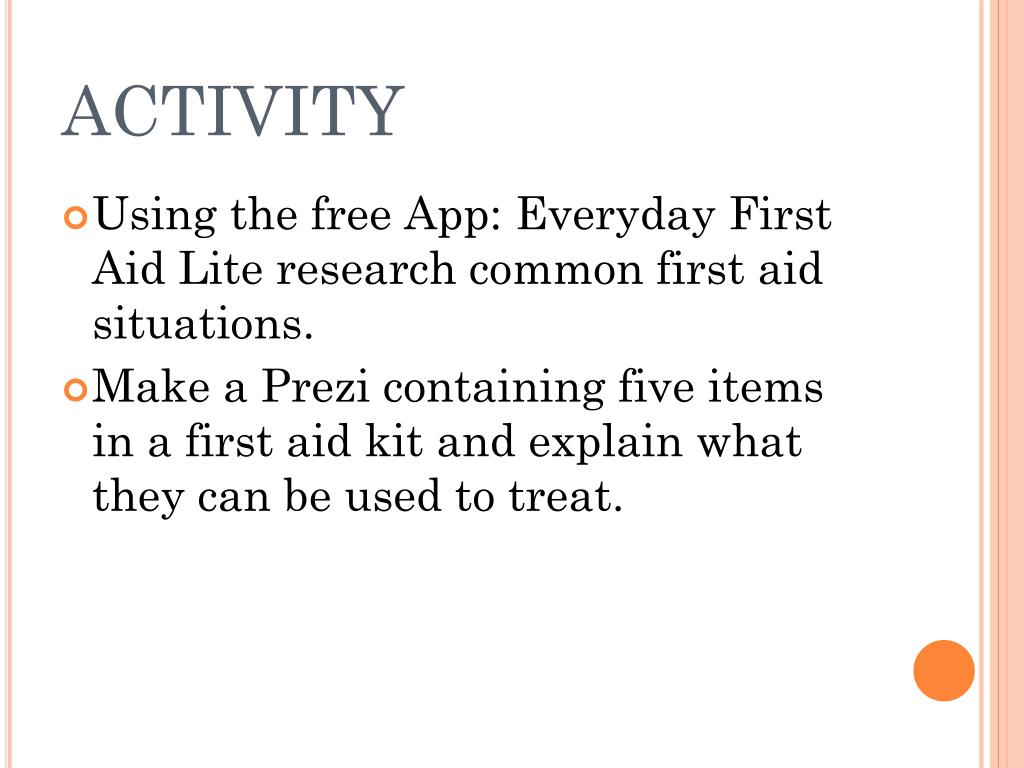 5. activity • Using the free App: Everyday First Aid Lite research common first aid situations. • Make a Prezi containing five items in a first aid kit and explain what they can be used to treat.