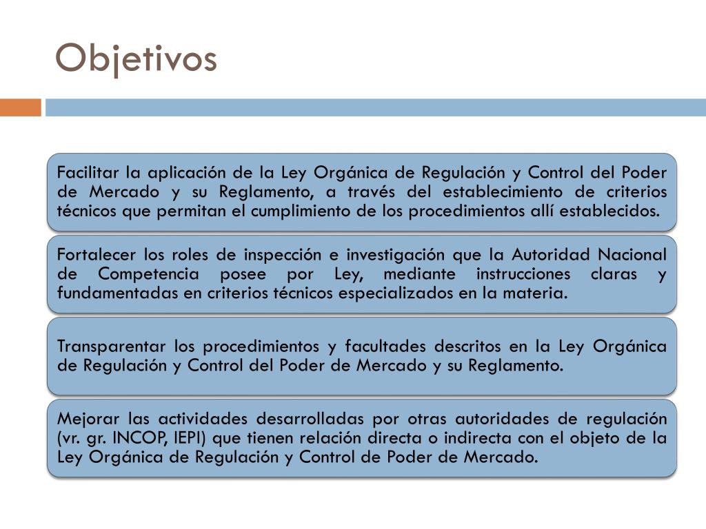 Antecedentes • La Dirección de Competencia existe desde marzo de 2009 en virtud del Decreto Ejecutivo No. 1614. Su competencia se fundamentó hasta octubre de 2011 en la Decisión No. 608 de la CAN. • El 13 de octubre de 2011 se publica y entra en vigencia la Ley Orgánica de Regulación y Control del Poder de Mercado. • La Disposición Transitoria Tercera establece que la Subsecretaría de Competencia y Defensa del Consumidor, y el Ministerio de Industrias y Productividad actúan como autoridades transitorias de investigación y resolución respectivamente, hasta la conformación de la Superintendencia de Control de Poder de Mercado. • La Dirección de Competencia tiene las siguientes competencias de acuerdo al Acuerdo Ministerial 9247 (Art. 2) y al DE 1614 (Art. 2): • Es la autoridad nacional en materia de libre competencia para que conforme el Comité Andino de Defensa de la Libre Competencia. • Promoción, difusión, investigación y sanción en materia de competencia. • El Art. 37 de la LORCPM establece que a la Superintendencia de Control de Poder de Mercado le corresponde asegurar la transparencia y eficiencia en los mercados, fomentar la competencia, y prevenir, investigar, corregir y sancionar las conductas anticompetitivas. • Podrá para esto expedir normas de carácter generalmente obligatorias que permitan el cumplimiento de lo que establece la Ley y su Reglamento.