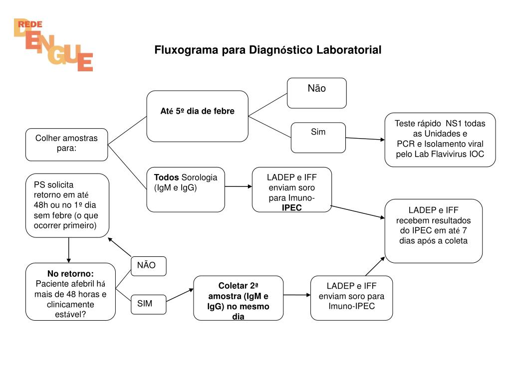Não Até 5º dia de febre Teste rápido NS1 todas as Unidades e PCR e Isolamento viral pelo Lab Flavivirus IOC Sim Colher amostras para: Todos Sorologia (IgM e IgG) LADEP e IFF enviam soro para Imuno-IPEC PS solicita retorno em até 48h ou no 1º dia sem febre (o que ocorrer primeiro) LADEP e IFF recebem resultados do IPEC em até 7 dias após a coleta NÃO No retorno: Paciente afebril há mais de 48 horas e clinicamente estável? Coletar 2ª amostra (IgM e IgG) no mesmo dia LADEP e IFF enviam soro para Imuno-IPEC SIM Fluxograma para Diagnóstico Laboratorial