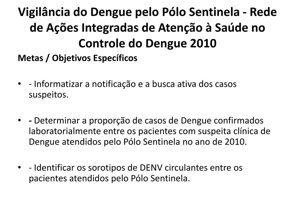 Vigilância do Dengue pelo Pólo Sentinela - Rede de Ações Integradas de Atenção à Saúde no Controle do Dengue 2010 Metas / Objetivos Específicos • - Informatizar a notificação e a busca ativa dos casos suspeitos. • - Determinar a proporção de casos de Dengue confirmados laboratorialmente entre os pacientes com suspeita clínica de Dengue atendidos pelo Pólo Sentinela no ano de 2010. • - Identificar os sorotipos de DENV circulantes entre os pacientes atendidos pelo Pólo Sentinela.