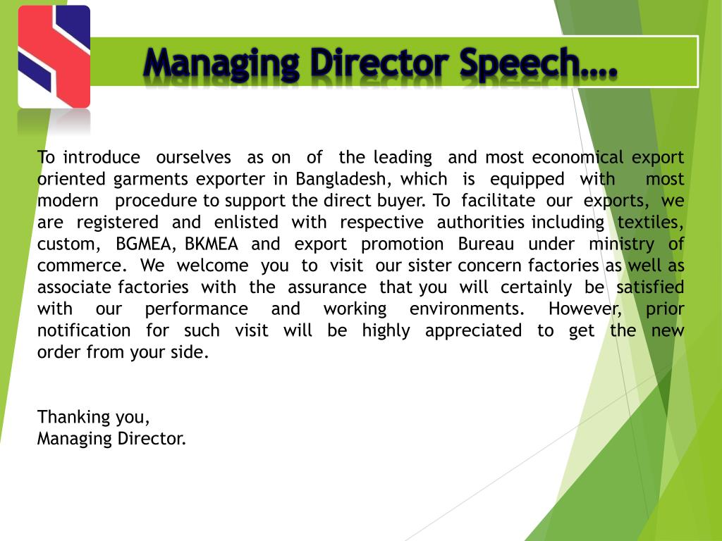 Managing Director Speech…. To introduce ourselves as on of the leading and most economical export oriented garments exporter in Bangladesh, which is equipped with most modern procedure to support the direct buyer. To facilitate our exports, we are registered and enlisted with respective authorities including textiles, custom, BGMEA, BKMEA and export promotion Bureau under ministry of commerce. We welcome you to visit our sister concern factories as well as associate factories with the assurance that you will certainly be satisfied with our performance and working environments. However, prior notification for such visit will be highly appreciated to get the new order from your side. Thanking you, Managing Director.