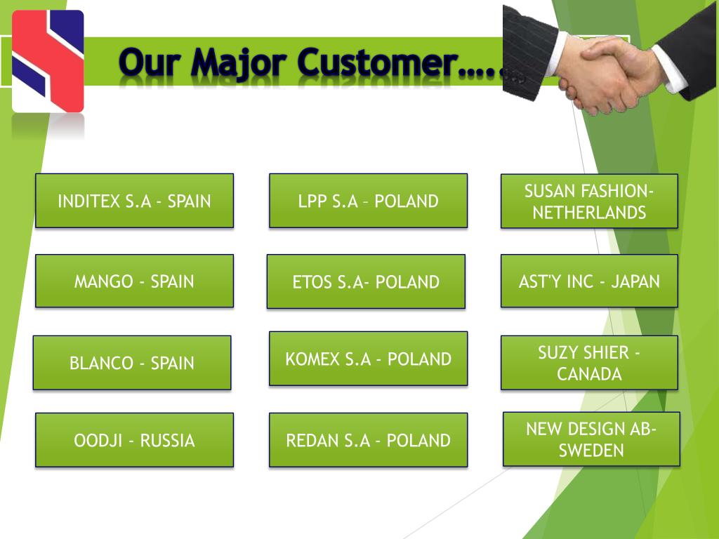 Our Major Customer….. INDITEX S.A - SPAIN LPP S.A – POLAND SUSAN FASHION-NETHERLANDS AST'Y INC - JAPAN MANGO - SPAIN ETOS S.A- POLAND KOMEX S.A - POLAND BLANCO - SPAIN SUZY SHIER - CANADA NEW DESIGN AB- SWEDEN OODJI - RUSSIA REDAN S.A - POLAND