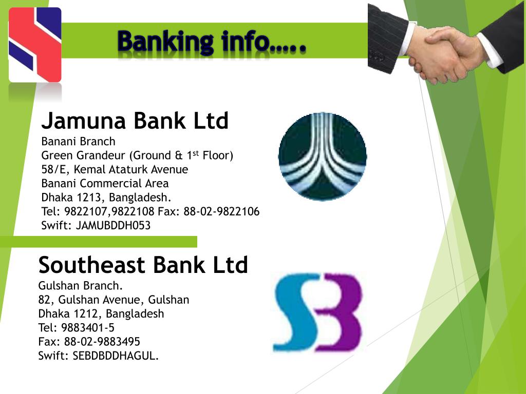 Banking info….. Jamuna Bank Ltd Banani Branch Green Grandeur (Ground & 1st Floor) 58/E, Kemal Ataturk Avenue Banani Commercial Area Dhaka 1213, Bangladesh. Tel: 9822107,9822108 Fax: 88-02-9822106 Swift: JAMUBDDH053 Southeast Bank Ltd GulshanBranch. 82, Gulshan Avenue, Gulshan Dhaka 1212, Bangladesh Tel: 9883401-5 Fax: 88-02-9883495 Swift: SEBDBDDHAGUL.