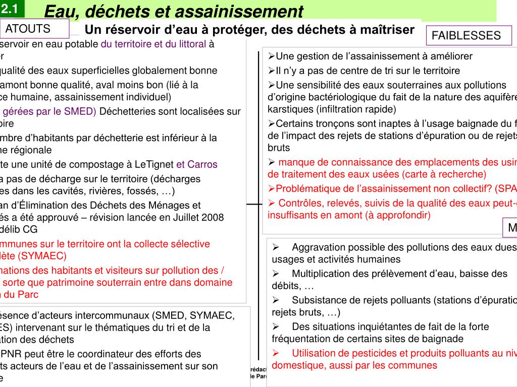 2.1 • Eau, déchets et assainissement ATOUTS Un réservoir d’eau à protéger, des déchets à maîtriser FAIBLESSES • Un réservoir en eau potable du territoire et du littoral à protéger • Une qualité des eaux superficielles globalement bonne • Loup amont bonne qualité, aval moins bon (lié à la présence humaine, assainissement individuel) • 5 (4/5 gérées par le SMED) Déchetteries sont localisées sur le territoire • Le nombre d’habitants par déchetterie est inférieur à la moyenne régionale • Il existe une unité de compostage à LeTignet et Carros • Il n’y a pas de décharge sur le territoire (décharges sauvages dans les cavités, rivières, fossés, …) • Le Plan d’Élimination des Déchets des Ménages et Assimilés a été approuvé – révision lancée en Juillet 2008 suite à délib CG • 37 communes sur le territoire ont la collecte sélective incomplète (SYMAEC) • Informations des habitants et visiteurs sur pollution des / faire en sorte que patrimoine souterrain entre dans domaine d’action du Parc • Une gestion de l’assainissement à améliorer • Il n’y a pas de centre de tri sur le territoire • Une sensibilité des eaux souterraines aux pollutions d’origine bactériologique du fait de la nature des aquifères karstiques (infiltration rapide) • Certains tronçons sont inaptes à l’usage baignade du fait de l’impact des rejets de stations d’épuration ou de rejets bruts • manque de connaissance des emplacements des usines de traitement des eaux usées (carte à recherche) • Problématique de l’assainissement non collectif? (SPANC) • Contrôles, relevés, suivis de la qualité des eaux peut-être insuffisants en amont (à approfondir) OPPORTUNITES MENACES • Aggravation possible des pollutions des eaux dues aux usages et activités humaines • Multiplication des prélèvement d’eau, baisse des débits, … • Subsistance de rejets polluants (stations d’épuration, rejets bruts, …) • Des situations inquiétantes de fait de la forte fréquentation de certains sites de baignade • Utilisation de pesticides et produits polluants au niveau domestique, aussi par les communes [1] Article R333-1 du code de l’environnement. • Présence d’acteurs intercommunaux (SMED, SYMAEC, SIVADES) intervenant sur le thématiques du tri et de la valorisation des déchets • Le PNR peut être le coordinateur des efforts des différents acteurs de l’eau et de l’assainissement sur son territoire • L’eau peut permettre de rétablir un lien symbolique entre le territoire et la côte (trame bleue) • Démarches en cours sur les périmètres de protection des captages d’eau