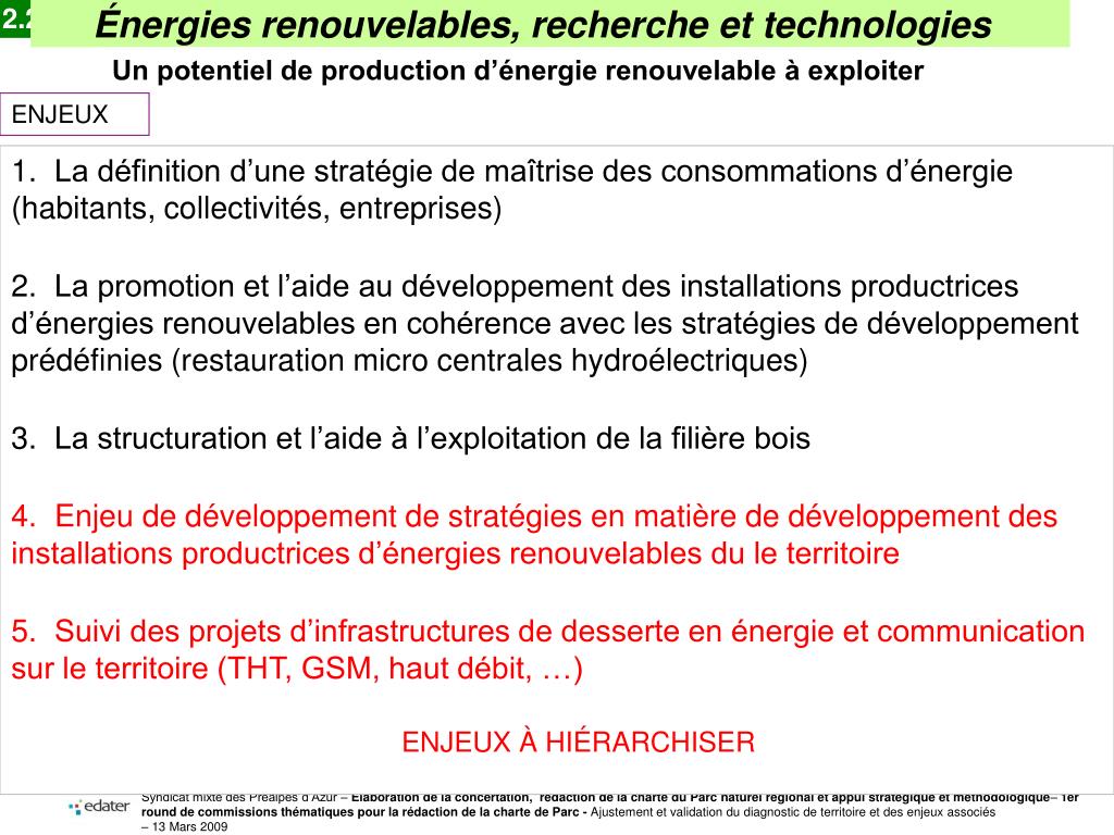 2.2 • Énergies renouvelables, recherche et technologies Un potentiel de production d’énergie renouvelable à exploiter ENJEUX • La définition d’une stratégie de maîtrise des consommations d’énergie (habitants, collectivités, entreprises) • La promotion et l’aide au développement des installations productrices d’énergies renouvelables en cohérence avec les stratégies de développement prédéfinies (restauration micro centrales hydroélectriques) • La structuration et l’aide à l’exploitation de la filière bois • Enjeu de développement de stratégies en matière de développement des installations productrices d’énergies renouvelables du le territoire • Suivi des projets d’infrastructures de desserte en énergie et communication sur le territoire (THT, GSM, haut débit, …) ENJEUX À HIÉRARCHISER