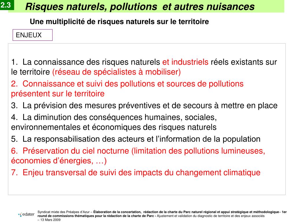 2.3 • Risques naturels, pollutions et autres nuisances Une multiplicité de risques naturels sur le territoire ENJEUX • La connaissance des risques naturels et industriels réels existants sur le territoire (réseau de spécialistes à mobiliser) • Connaissance et suivi des pollutions et sources de pollutions présentent sur le territoire • La prévision des mesures préventives et de secours à mettre en place • La diminution des conséquences humaines, sociales, environnementales et économiques des risques naturels • La responsabilisation des acteurs et l’information de la population • Préservation du ciel nocturne (limitation des pollutions lumineuses, économies d’énergies, …) • Enjeu transversal de suivi des impacts du changement climatique