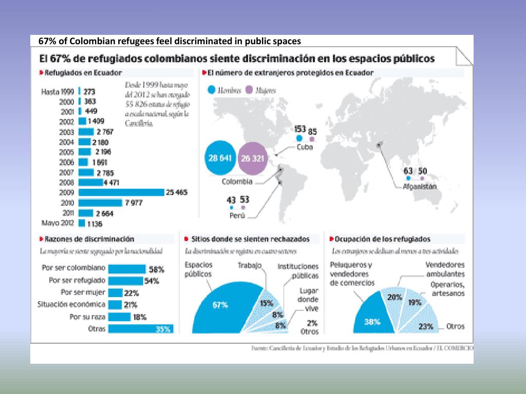 Ecuador is the country in South America with the highest number of refugees. They are approximately 250.000 but only 57.000 of them have a refugee status. 98% are Colombian refugees, from which some are victims of torture, survivors of massacres and survivors of extrajudicial killings. 60% of Colombian refugees are found in the cities of Quito, Guayaquil and Santo Domingo de los Tsáchilas.