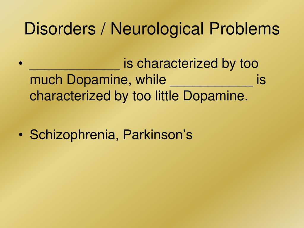 Disorders / Neurological Problems • ____________ is characterized by too much Dopamine, while ___________ is characterized by too little Dopamine. • Schizophrenia, Parkinson’s