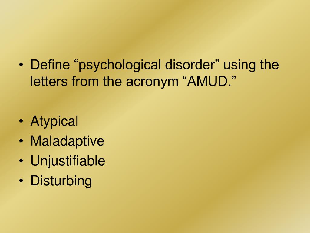Define “psychological disorder” using the letters from the acronym “AMUD.” • Atypical • Maladaptive • Unjustifiable • Disturbing