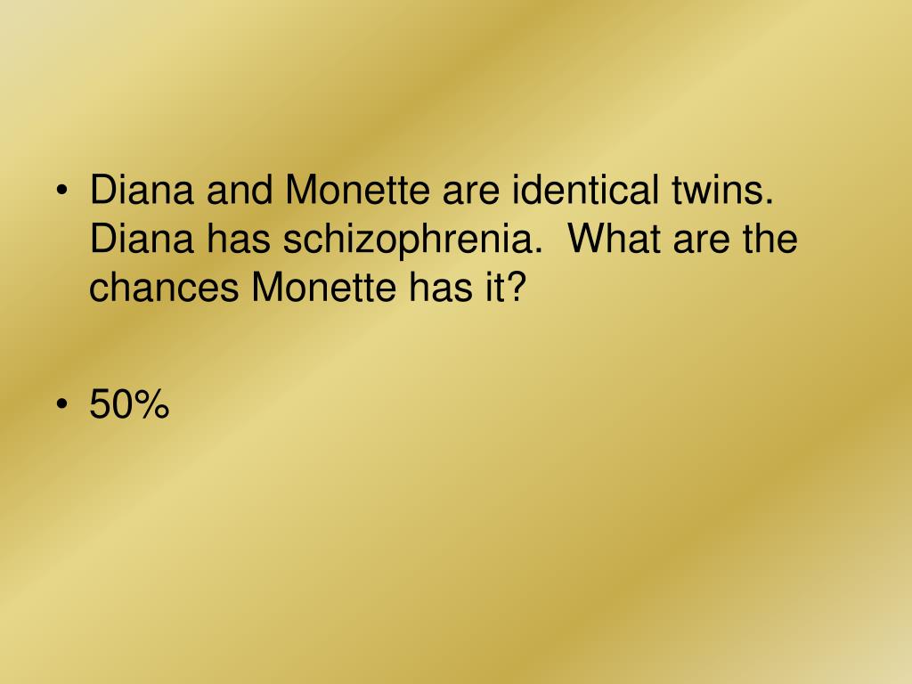Diana and Monette are identical twins. Diana has schizophrenia. What are the chances Monette has it? • 50%