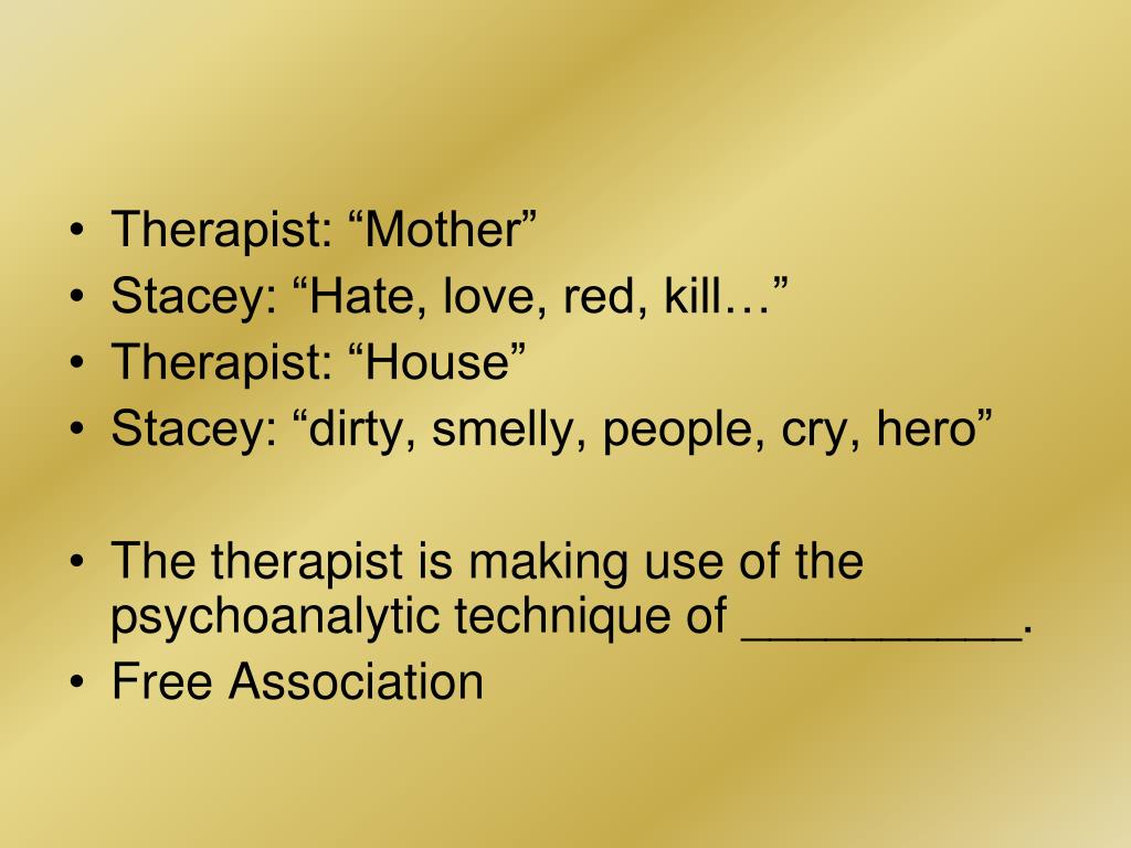Therapist: “Mother” • Stacey: “Hate, love, red, kill…” • Therapist: “House” • Stacey: “dirty, smelly, people, cry, hero” • The therapist is making use of the psychoanalytic technique of __________. • Free Association