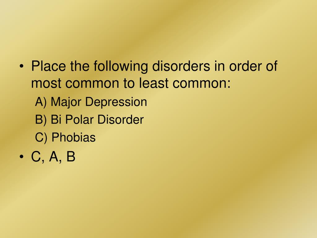 Place the following disorders in order of most common to least common: A) Major Depression B) Bi Polar Disorder C) Phobias • C, A, B