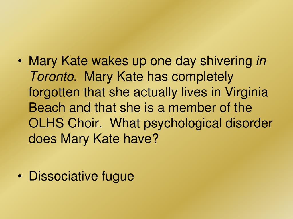 Mary Kate wakes up one day shivering in Toronto. Mary Kate has completely forgotten that she actually lives in Virginia Beach and that she is a member of the OLHS Choir. What psychological disorder does Mary Kate have? • Dissociative fugue