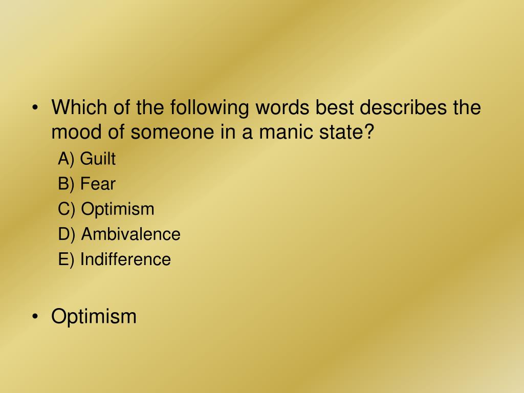 Which of the following words best describes the mood of someone in a manic state? A) Guilt B) Fear C) Optimism D) Ambivalence E) Indifference • Optimism