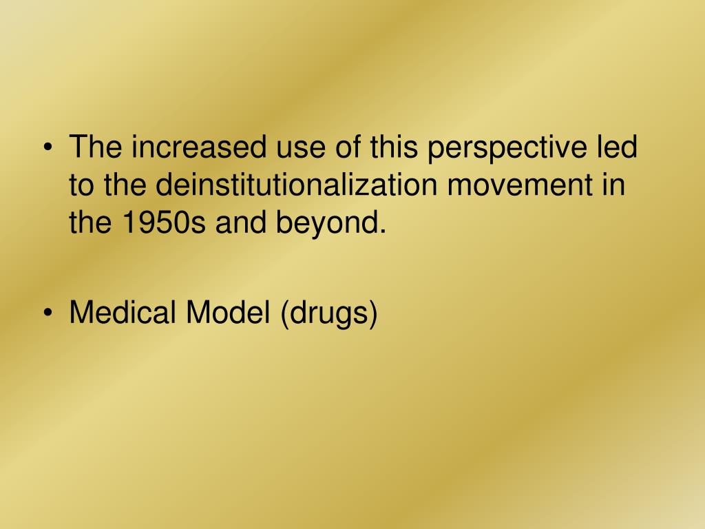 The increased use of this perspective led to the deinstitutionalization movement in the 1950s and beyond. • Medical Model (drugs)