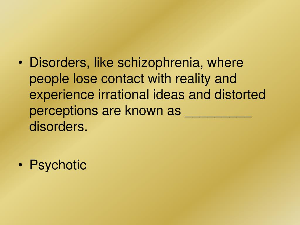 Disorders, like schizophrenia, where people lose contact with reality and experience irrational ideas and distorted perceptions are known as _________ disorders. • Psychotic