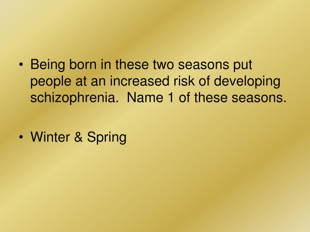 Being born in these two seasons put people at an increased risk of developing schizophrenia. Name 1 of these seasons. • Winter & Spring