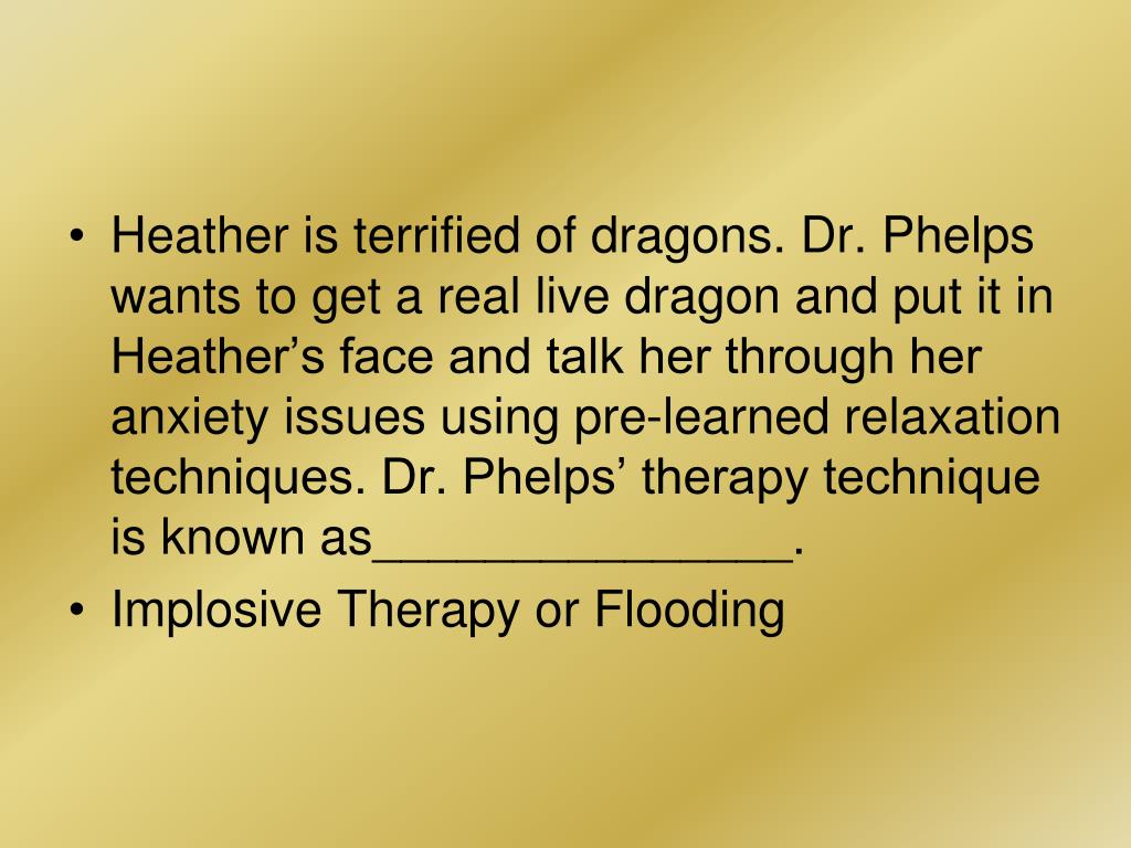 Heather is terrified of dragons. Dr. Phelps wants to get a real live dragon and put it in Heather’s face and talk her through her anxiety issues using pre-learned relaxation techniques. Dr. Phelps’ therapy technique is known as_______________. • Implosive Therapy or Flooding