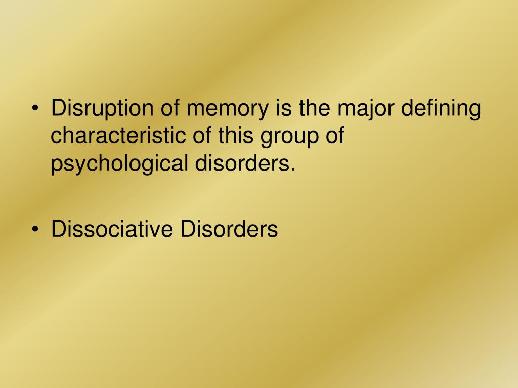 Disruption of memory is the major defining characteristic of this group of psychological disorders. • Dissociative Disorders