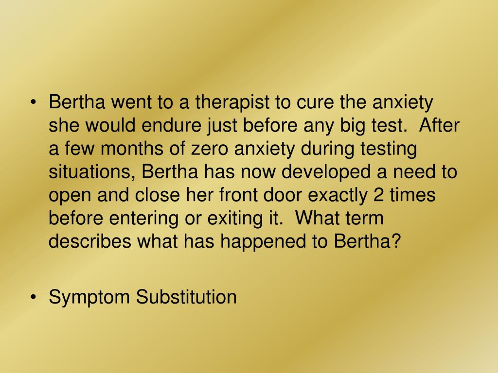 Bertha went to a therapist to cure the anxiety she would endure just before any big test. After a few months of zero anxiety during testing situations, Bertha has now developed a need to open and close her front door exactly 2 times before entering or exiting it. What term describes what has happened to Bertha? • Symptom Substitution