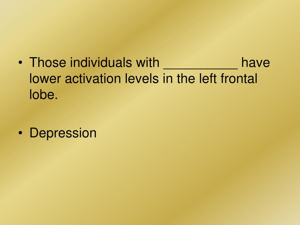 Those individuals with __________ have lower activation levels in the left frontal lobe. • Depression
