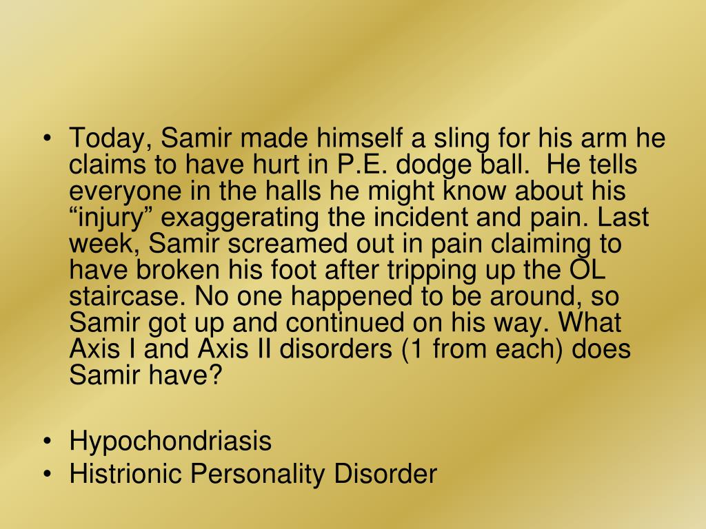 Today, Samir made himself a sling for his arm he claims to have hurt in P.E. dodge ball. He tells everyone in the halls he might know about his “injury” exaggerating the incident and pain. Last week, Samir screamed out in pain claiming to have broken his foot after tripping up the OL staircase. No one happened to be around, so Samir got up and continued on his way. What Axis I and Axis II disorders (1 from each) does Samir have? • Hypochondriasis • Histrionic Personality Disorder