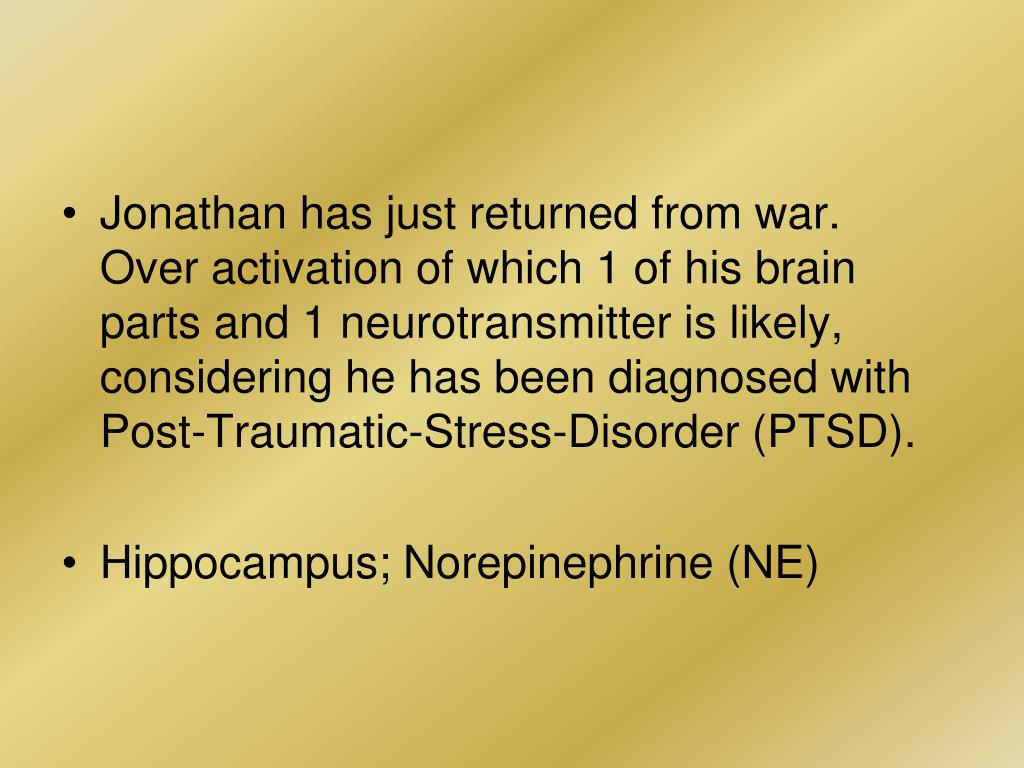 Jonathan has just returned from war. Over activation of which 1 of his brain parts and 1 neurotransmitter is likely, considering he has been diagnosed with Post-Traumatic-Stress-Disorder (PTSD). • Hippocampus; Norepinephrine (NE)