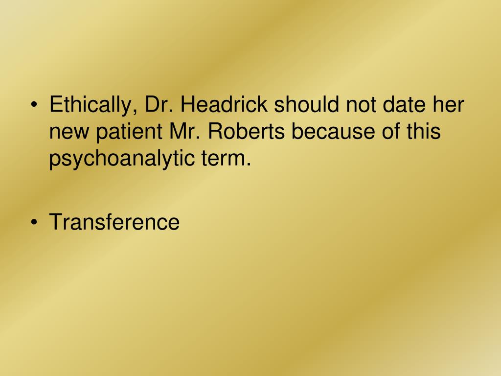 Ethically, Dr. Headrick should not date her new patient Mr. Roberts because of this psychoanalytic term. • Transference