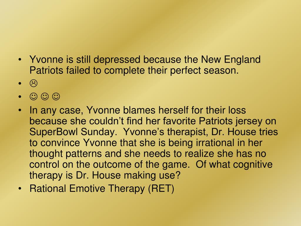 Yvonne is still depressed because the New England Patriots failed to complete their perfect season. • • • In any case, Yvonne blames herself for their loss because she couldn’t find her favorite Patriots jersey on SuperBowl Sunday. Yvonne’s therapist, Dr. House tries to convince Yvonne that she is being irrational in her thought patterns and she needs to realize she has no control on the outcome of the game. Of what cognitive therapy is Dr. House making use? • Rational Emotive Therapy (RET)